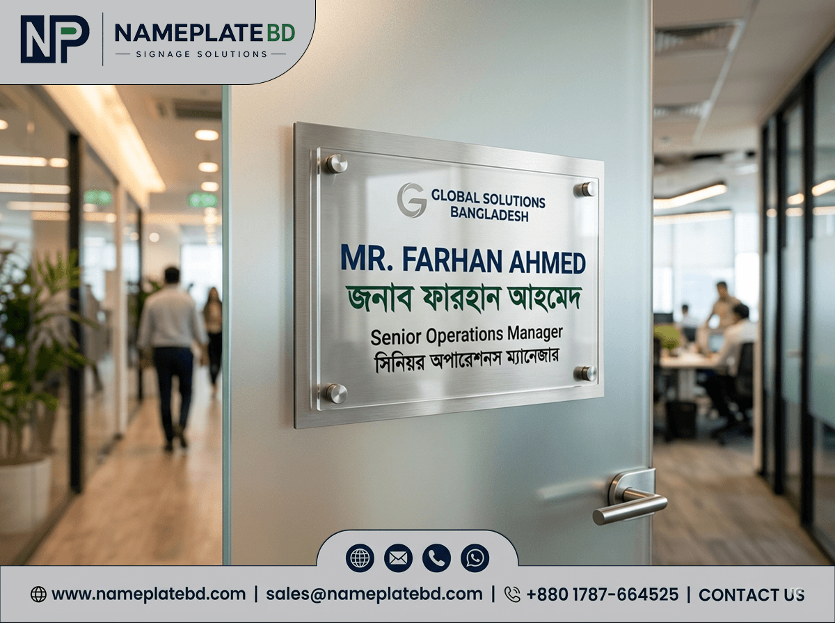 বাংলাদেশে প্রিমিয়াম কাস্টম নেম প্লেট ও সাইনেজ সলিউশন। আধুনিক ডিজাইন, দীর্ঘস্থায়ী ম্যাটেরিয়াল এবং দ্রুত ডেলিভারি সহ সেরা মানের সার্ভিস।